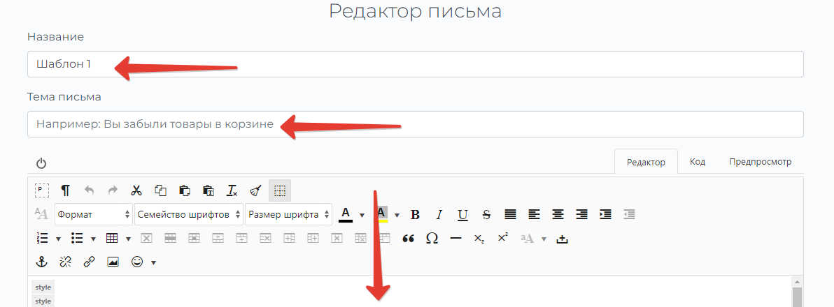 С помощью редактора отредактируйте предложенный шаблон, или создайте своё письмо с нуля, удалив шаблон по-умолчанию.