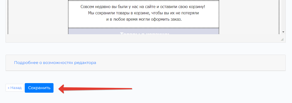 После того, как все правки в шаблон будут внесены, сохраните письмо нажатием кнопки «Сохранить», расположенной в конце редактора.